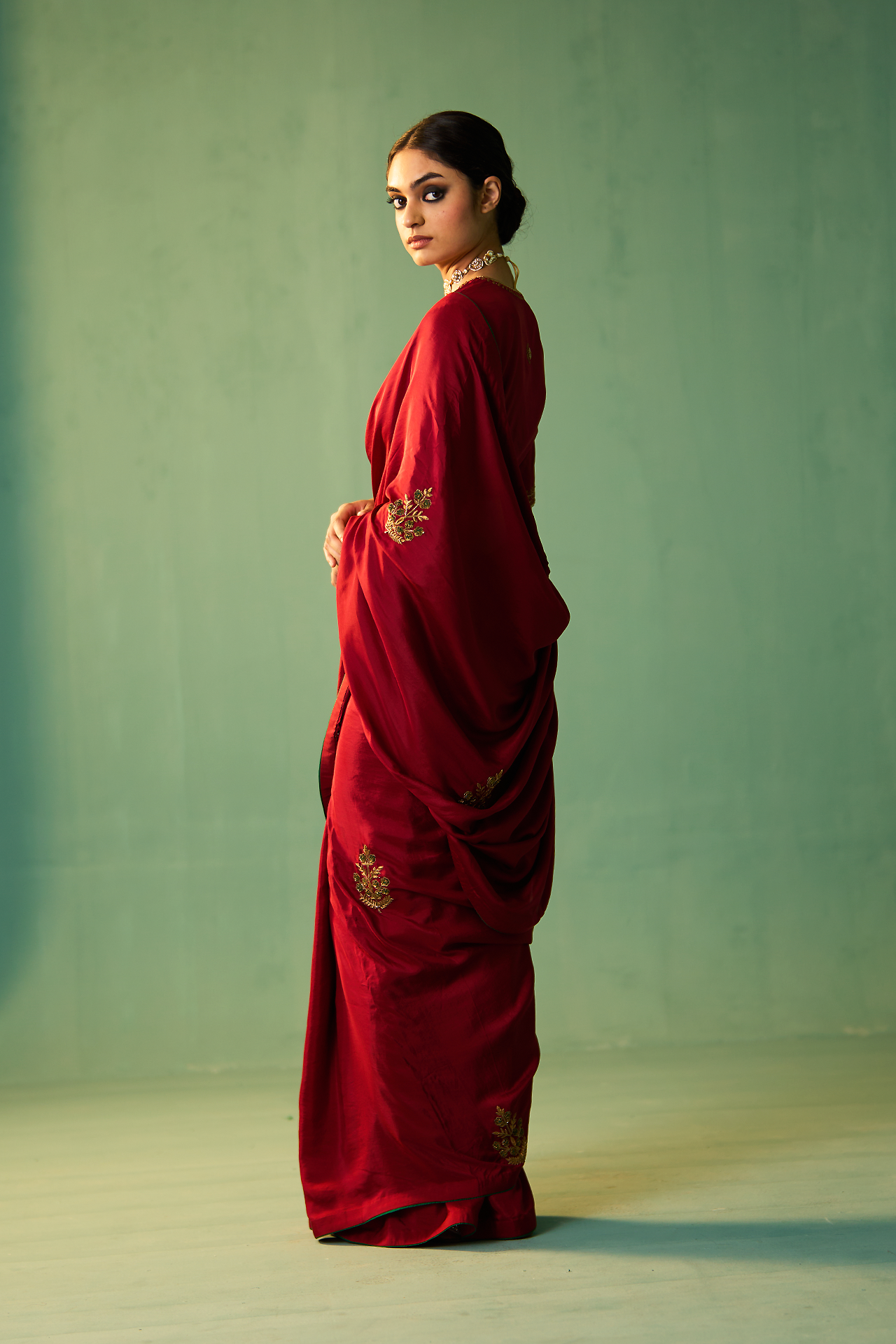 Description: 'DEVIKA' MAROON RED saree is made of plain Habutai silk, which allows for a better suited drape and fall