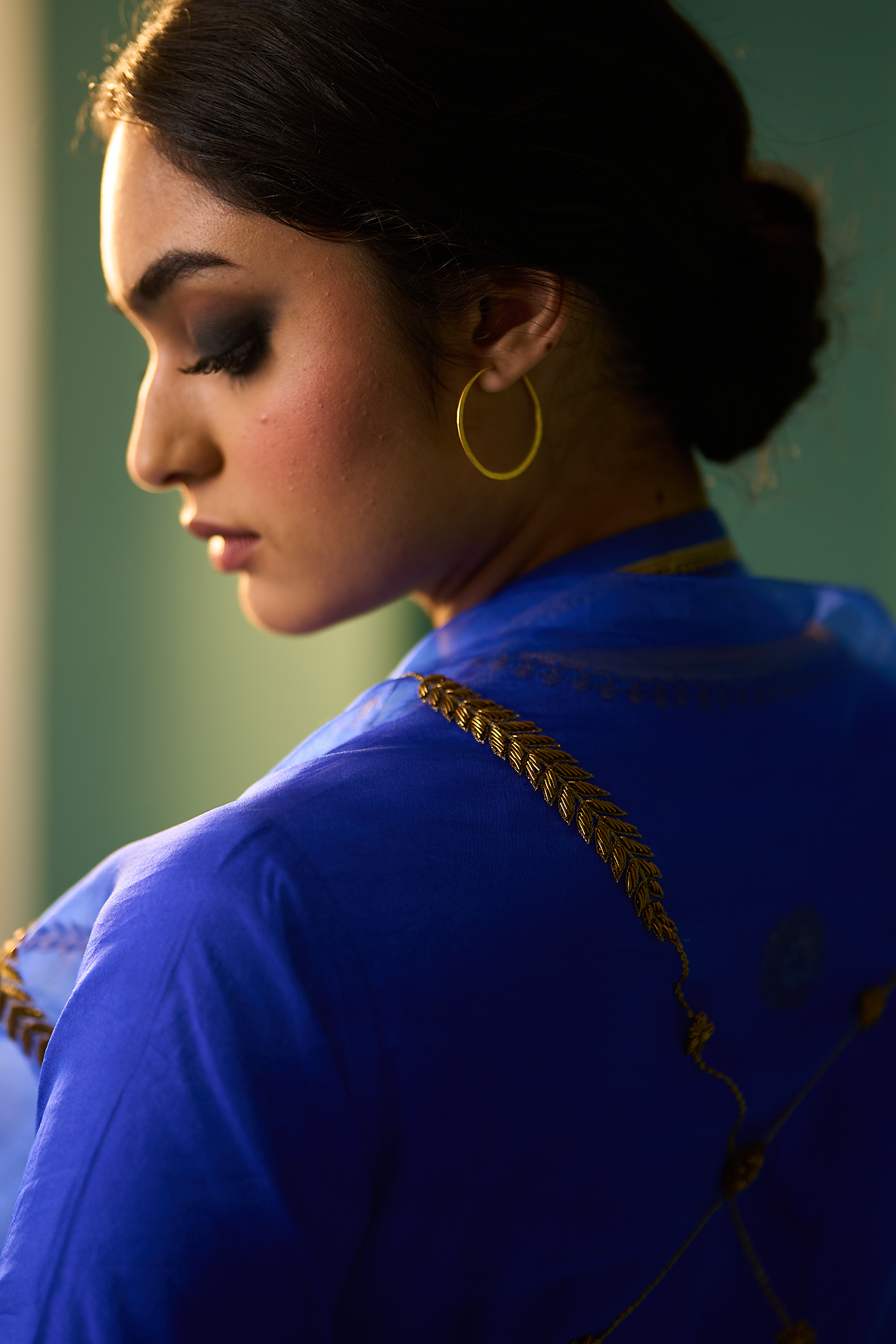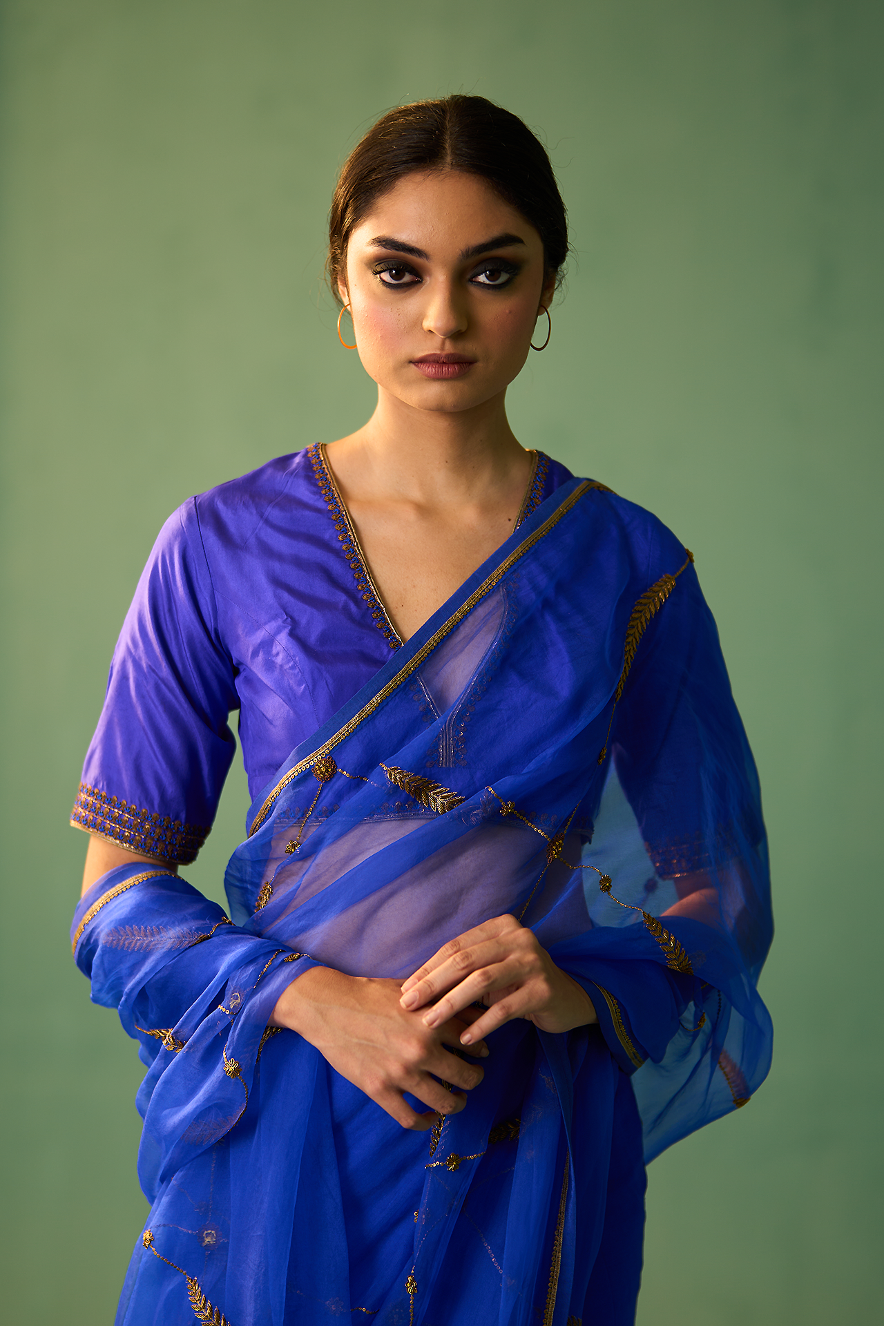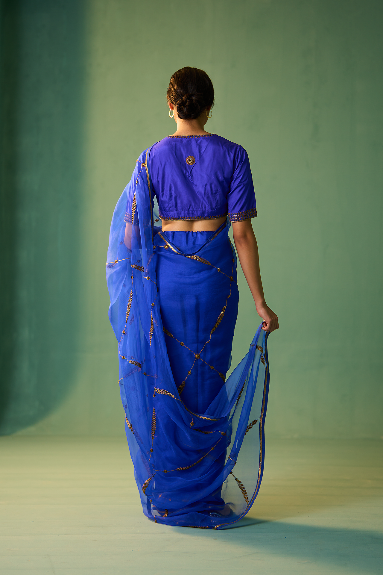 Description: 'SABAA' Electric Blue saree is made through half & half organza silk and plain Habutai silk, which allows for a better suited drape and fall