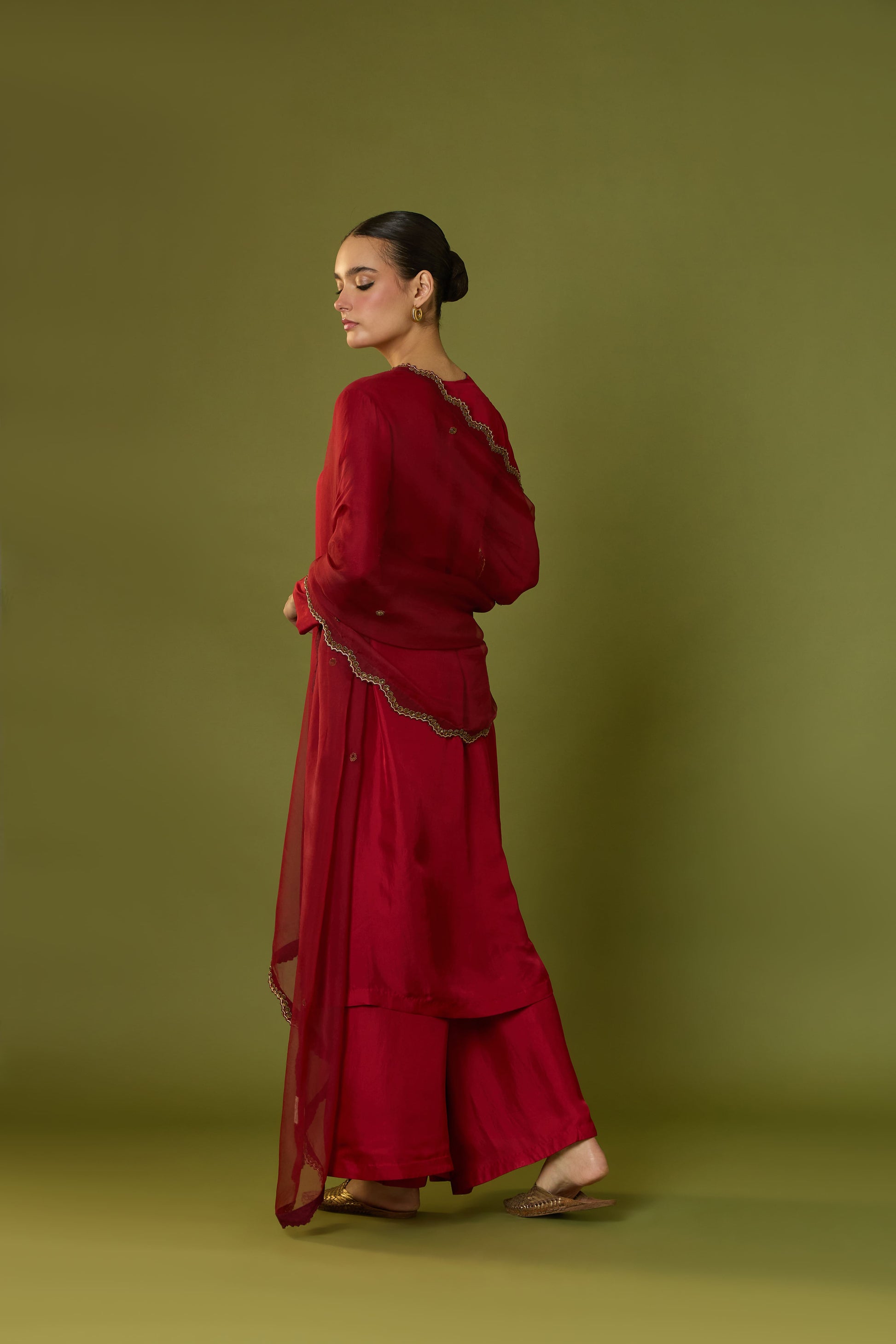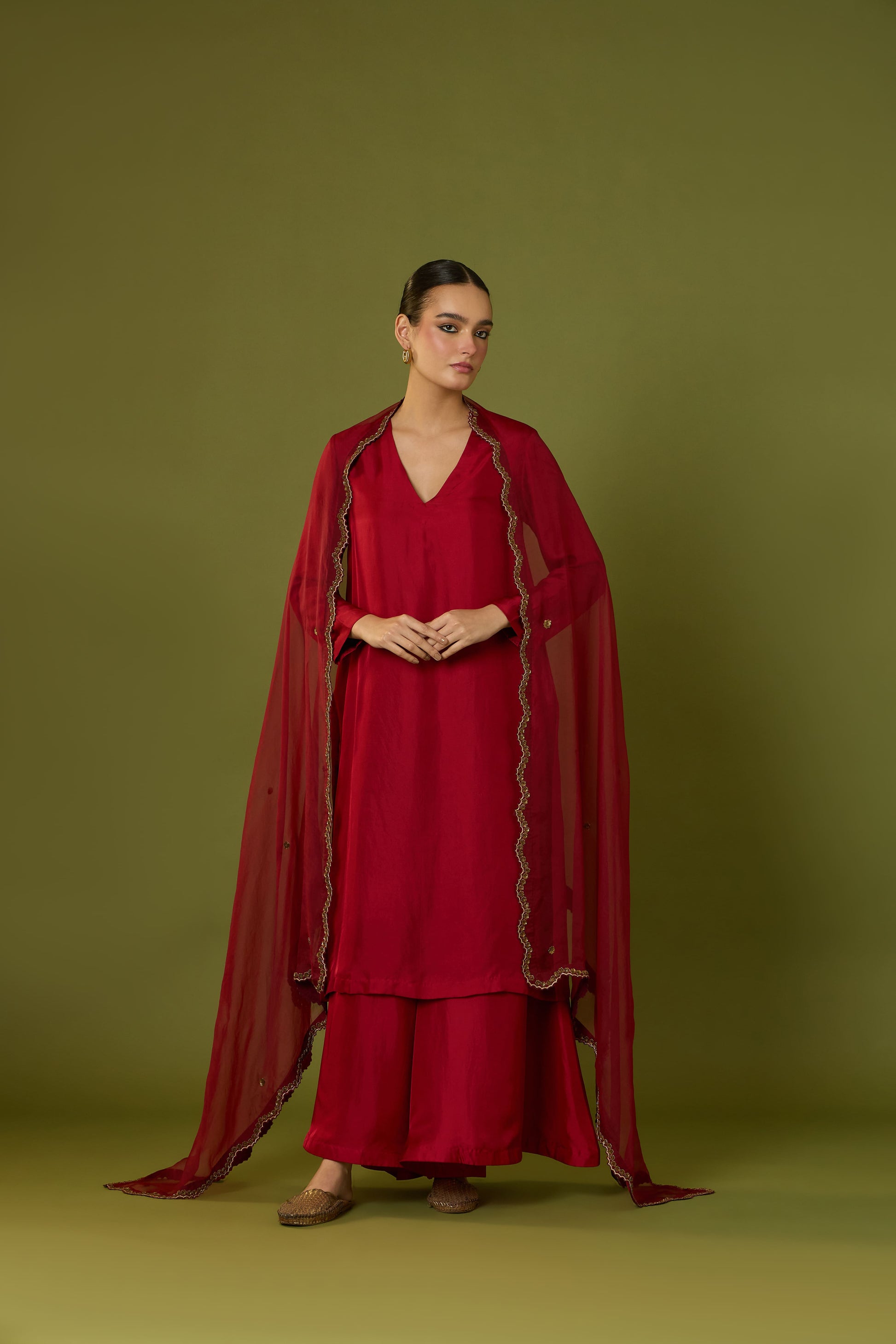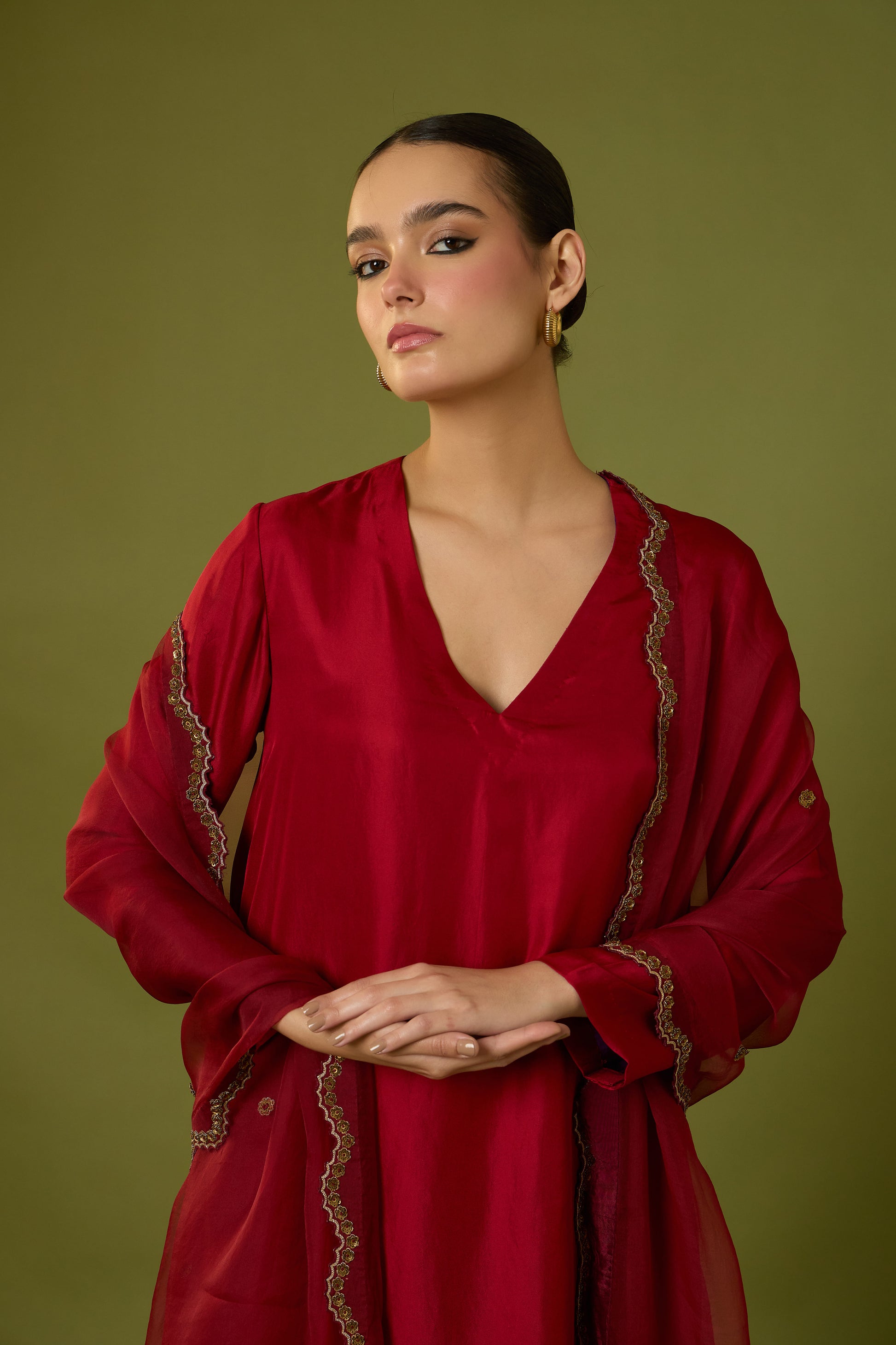 Description: 'GULNAAR' Maroon Red Twill Silk kurta is paired with Twill Silk Pant & Ziba Organza dupatta