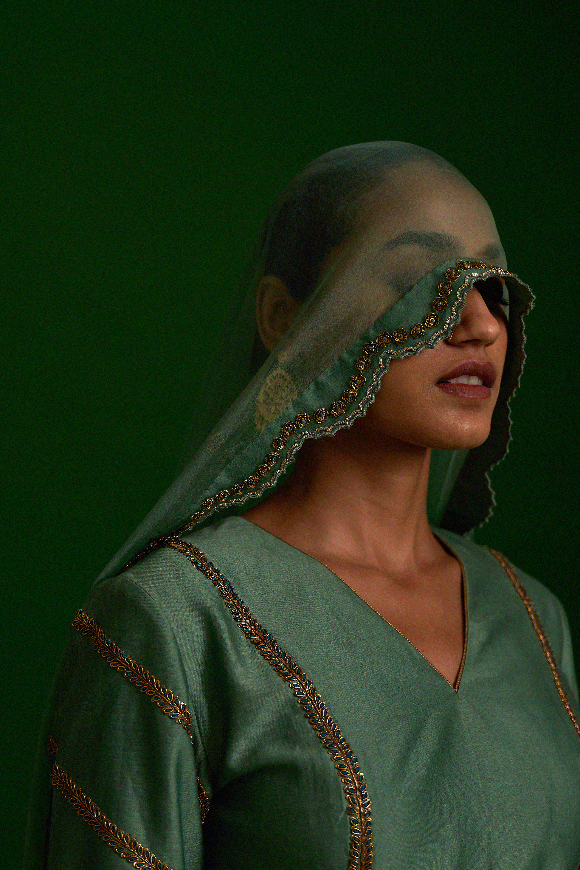 This 3 pcs set is adorned with elaborated techniques of 'Zardozi' & 'Marori' hand embroidery.