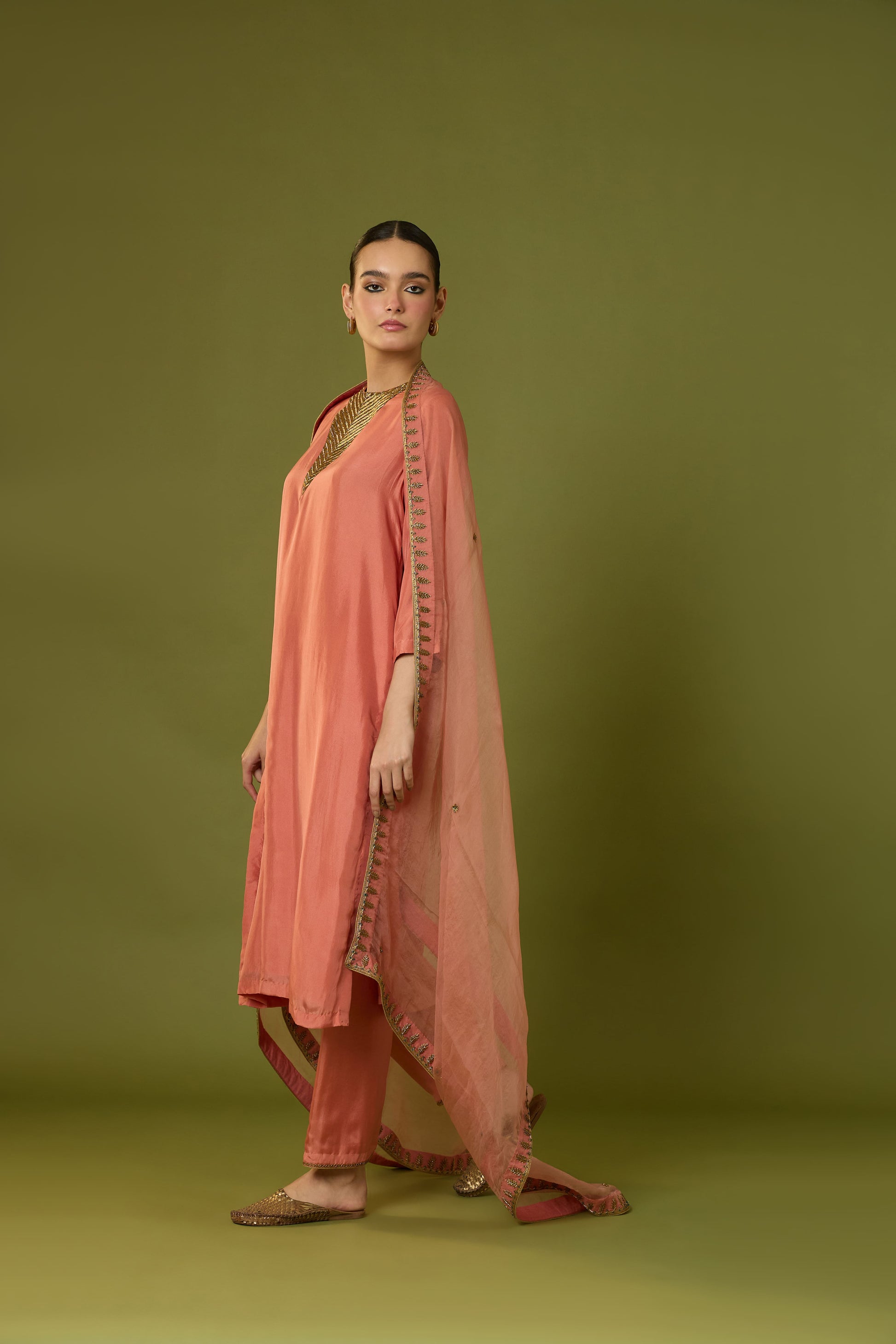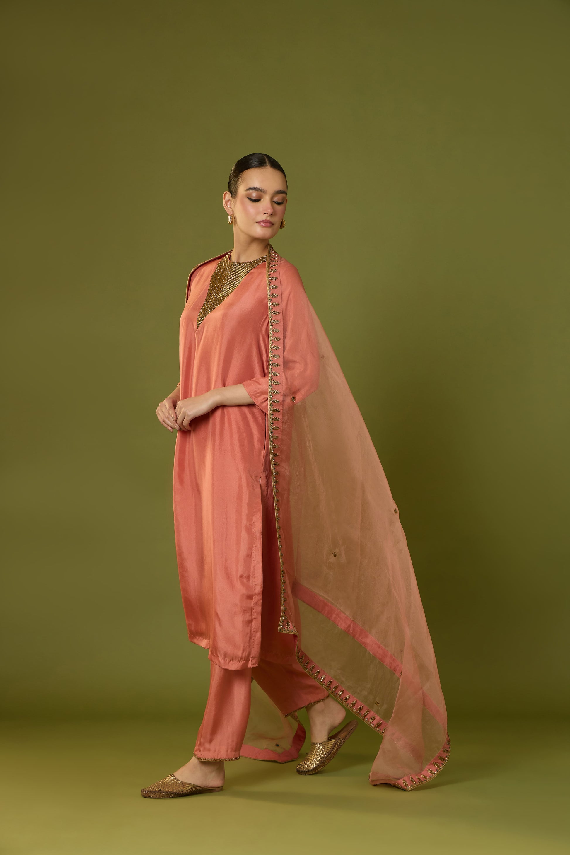 Description: 'HEER' Peach habutai silk kurta is paired with habutai silk Pant & Kiara organza dupatta