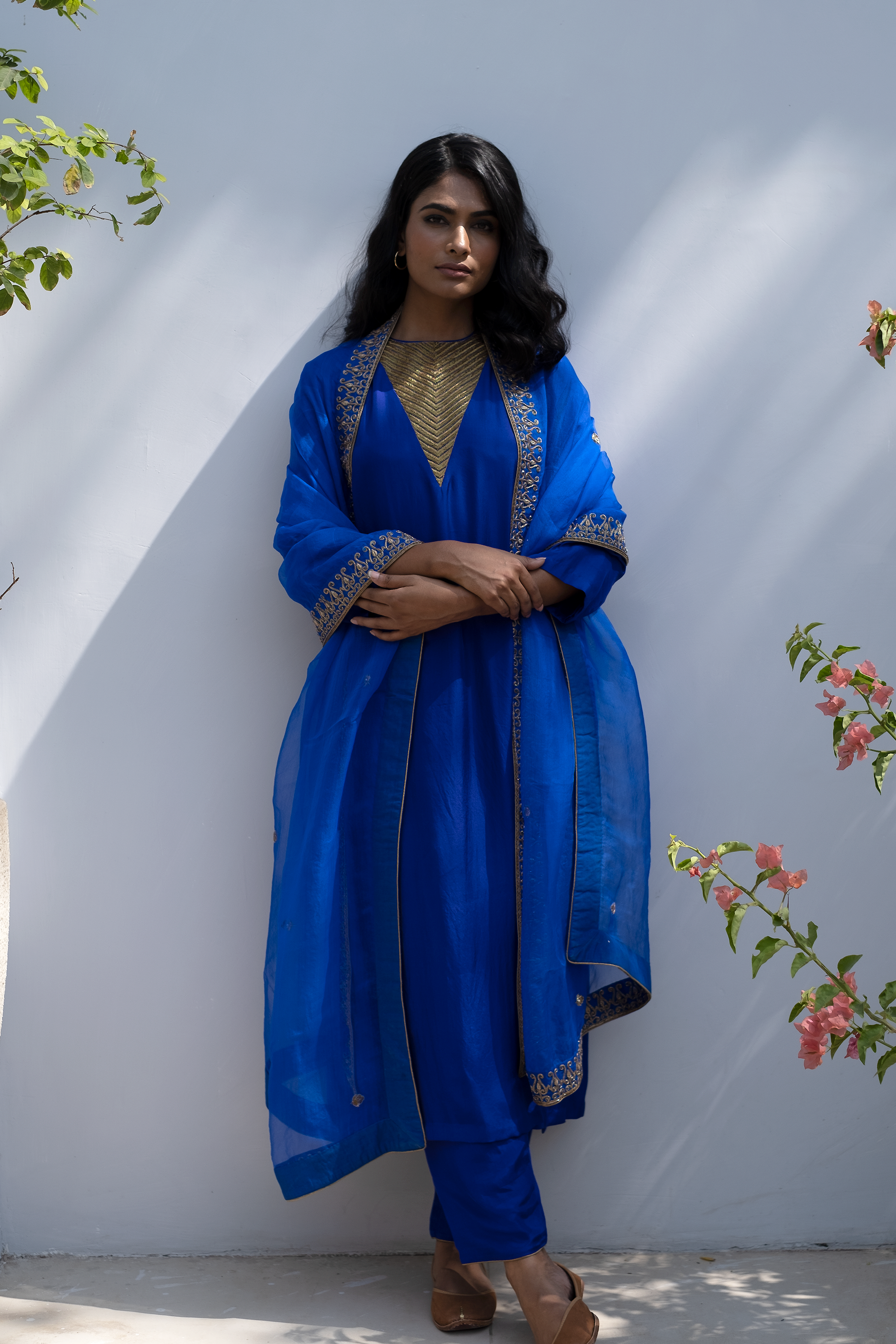 Description: 'HEEA' Electric Blue habutai silk kurta is paired with habutai silk Pant & organza dupatta