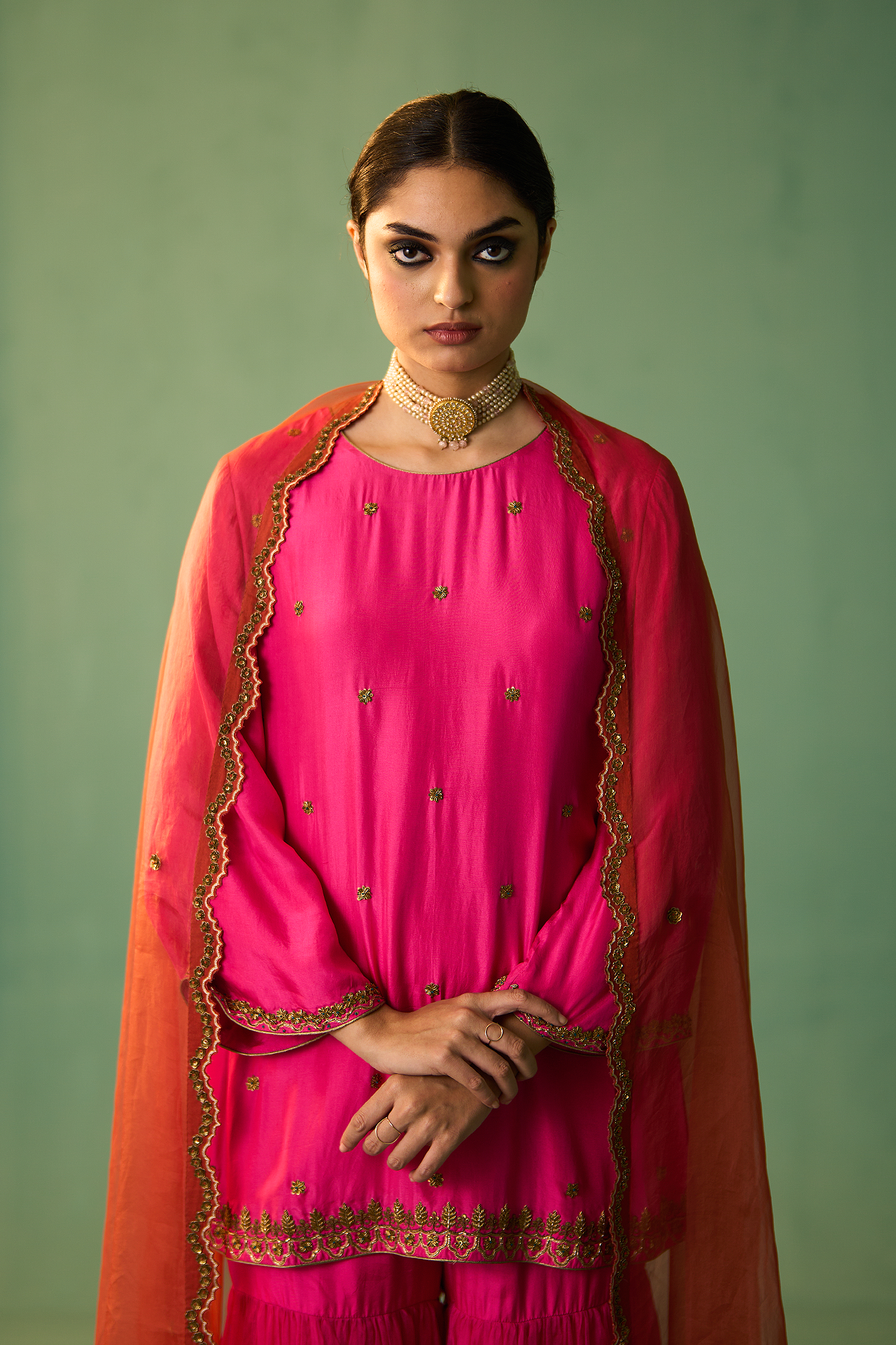 Material: Habutai Silk (Kurta & Sharara); Organza (Dupatta)