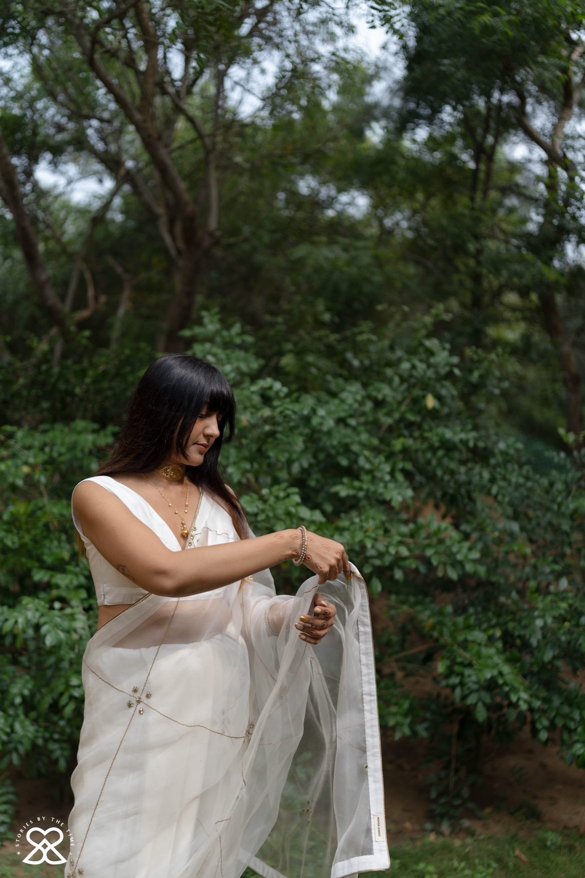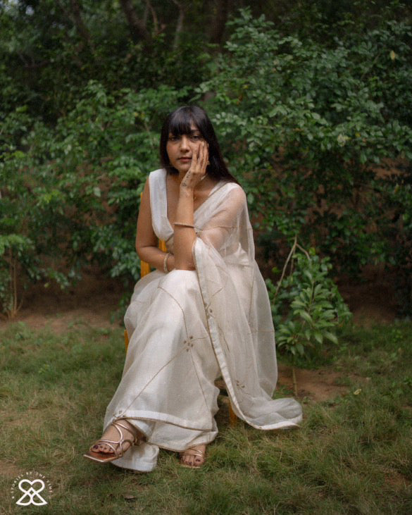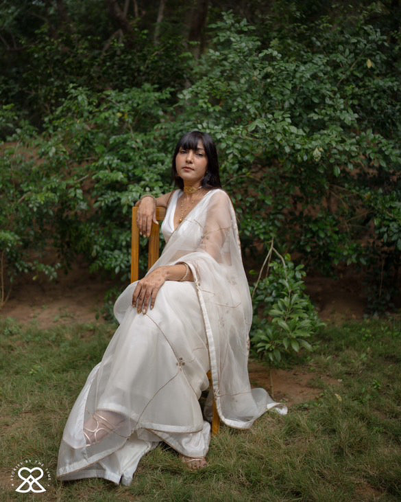 Description: 'MUNEER' Ivory Saree is made through half & half organza silk and plain Habutai silk, which allows for a better suited drape and fall