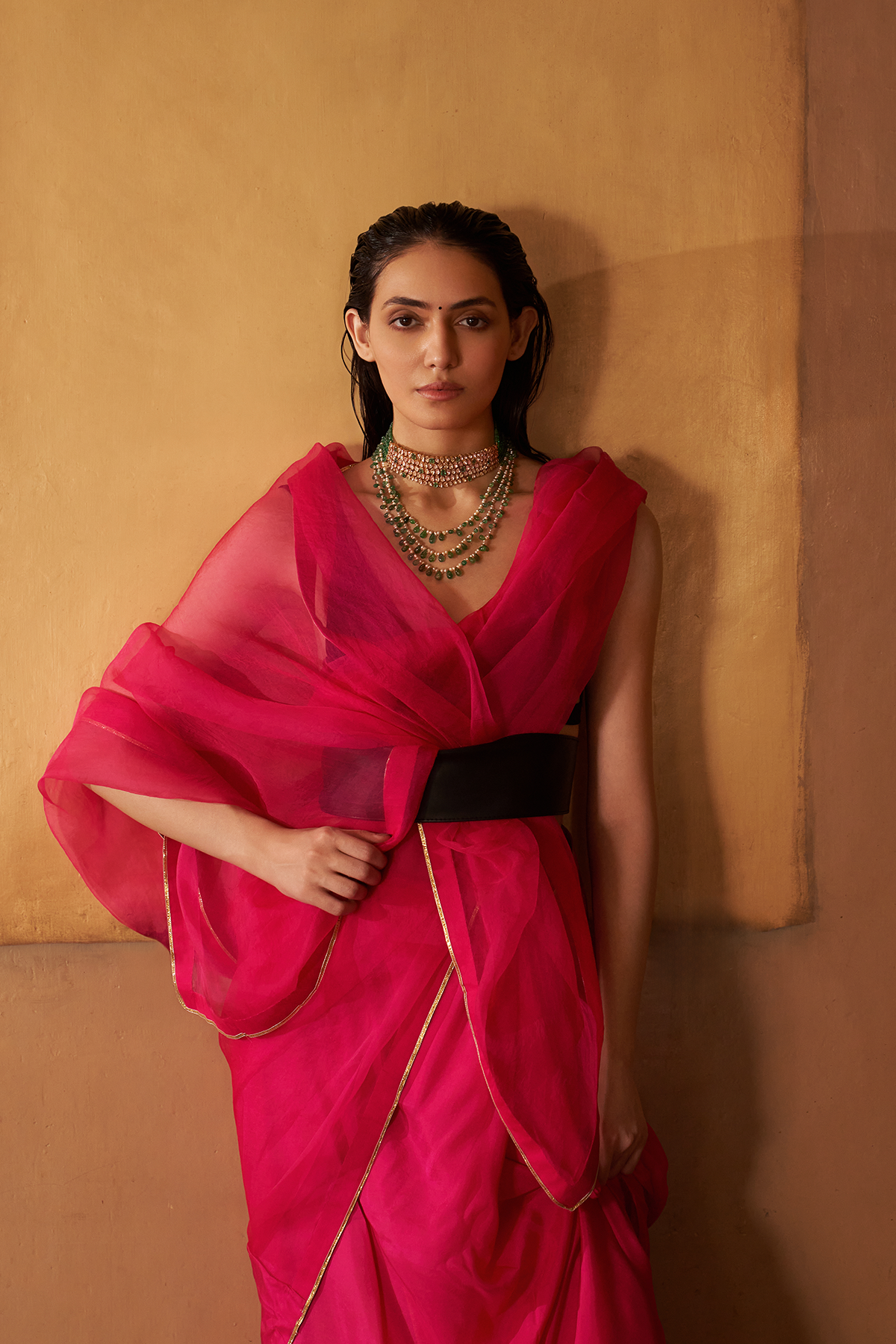 Description: 'NAILA' Fuchsia Flame saree is made through half & half organza silk and plain Habutai silk, which allows for a better suited drape and fall