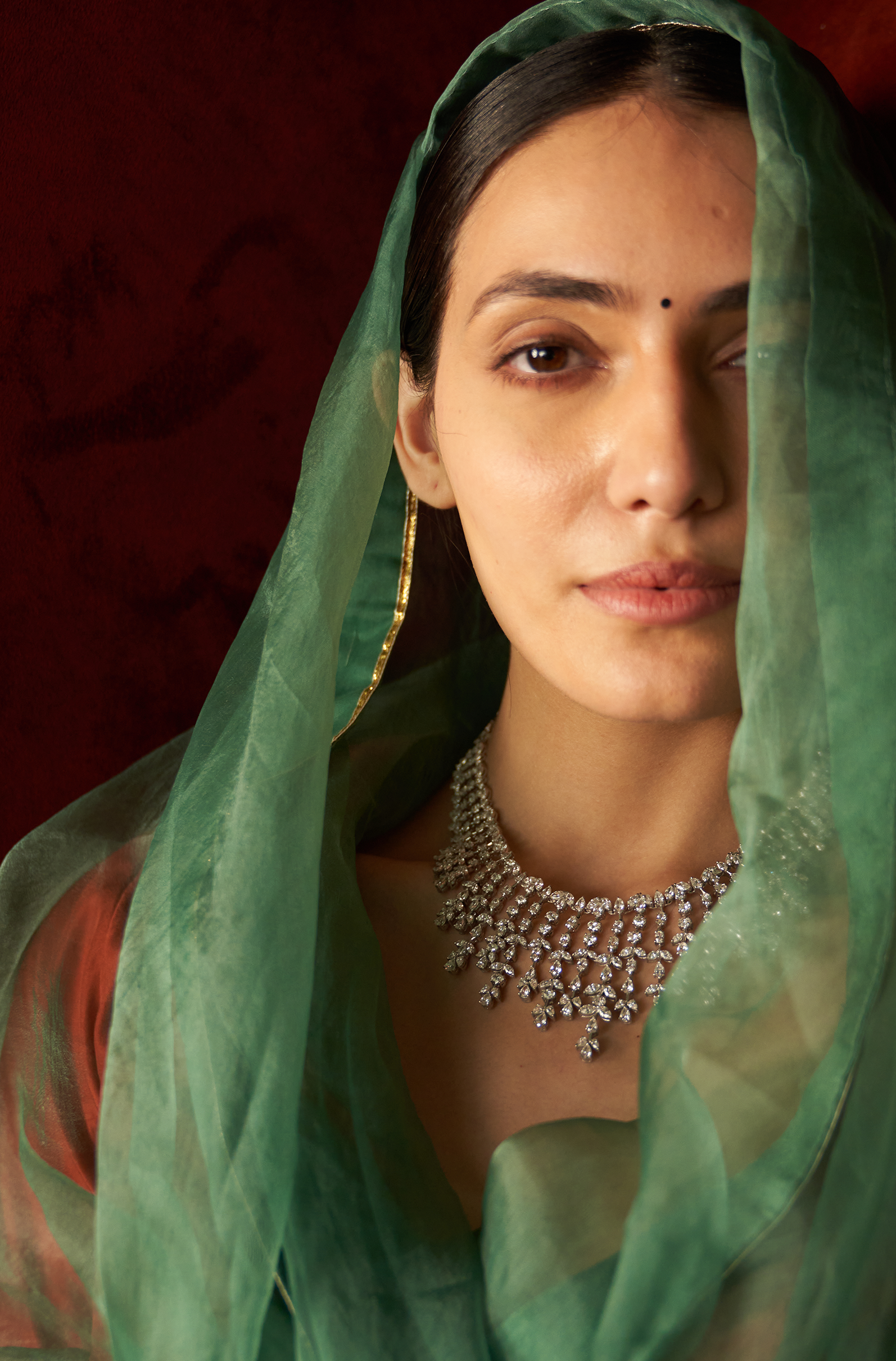 Description: 'NAILA' FOREST GLOW saree is made through half & half organza silk and plain Habutai silk, which allows for a better suited drape and fall