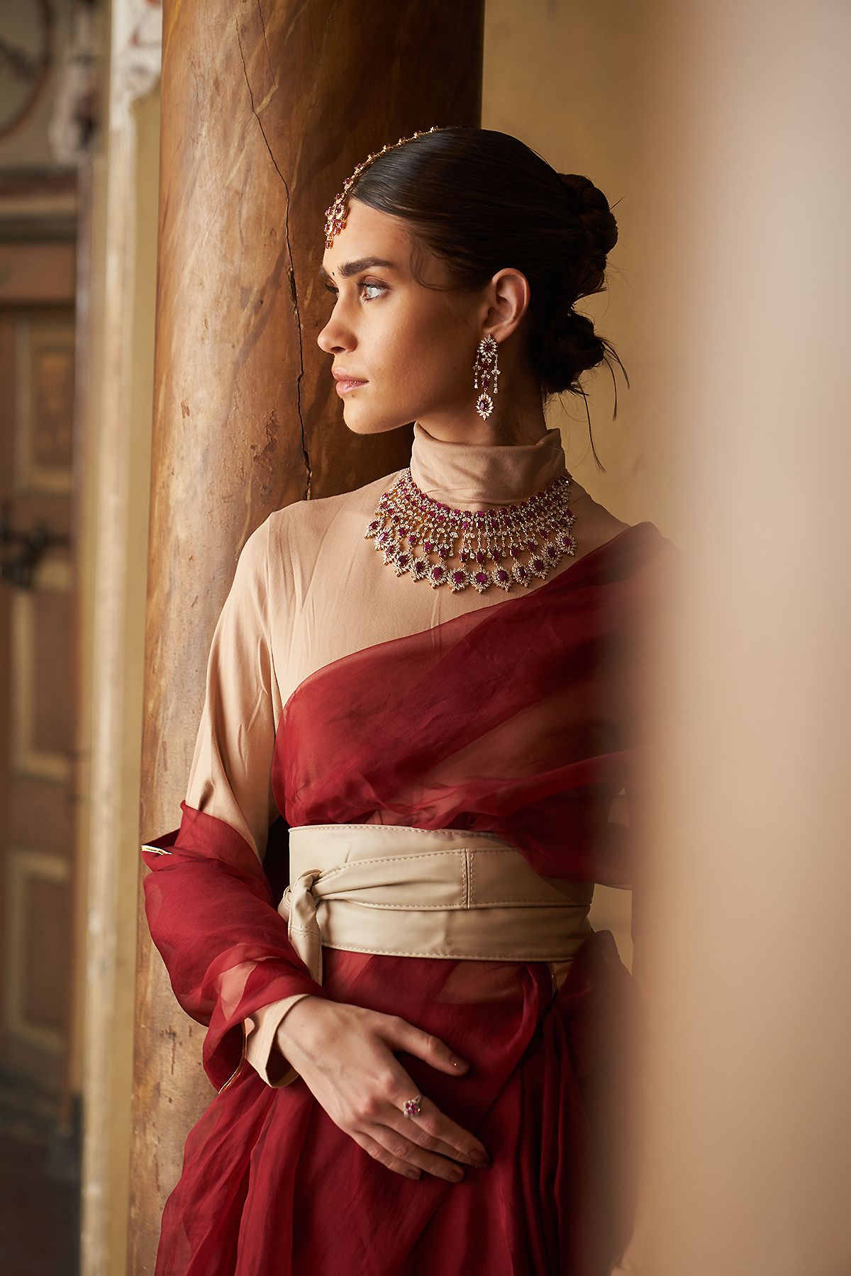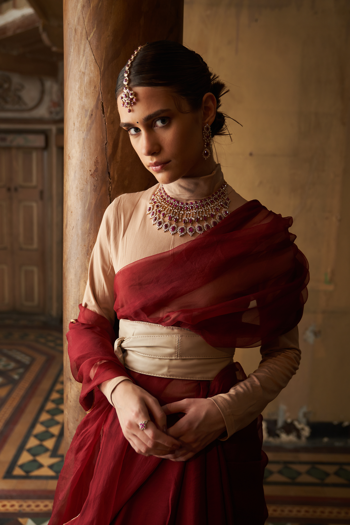 Description: 'NAILA' Ruby Maroon saree is made through half & half organza silk and plain Habutai silk, which allows for a better suited drape and fall