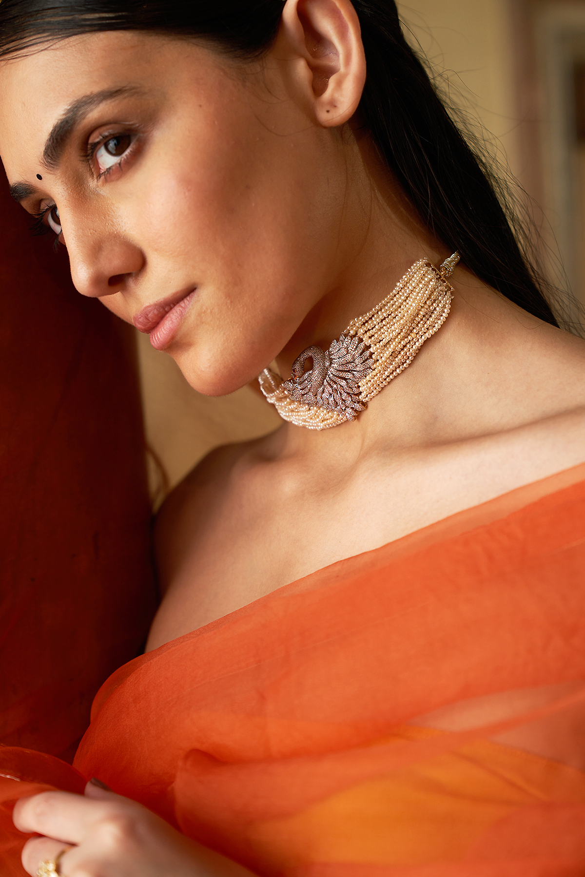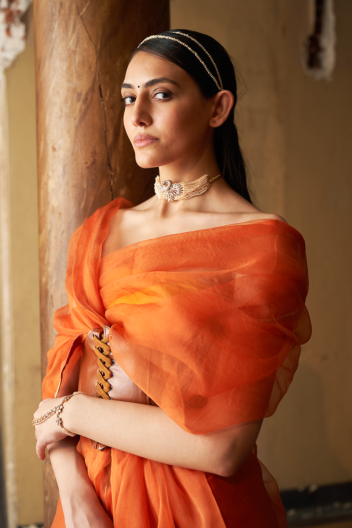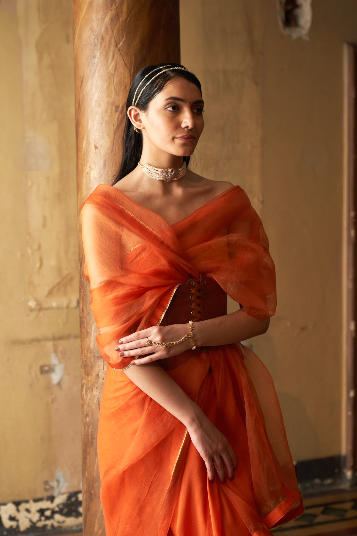 Description: 'NAILA' Warm orange saree is made through half & half organza silk and plain Habutai silk, which allows for a better suited drape and fall