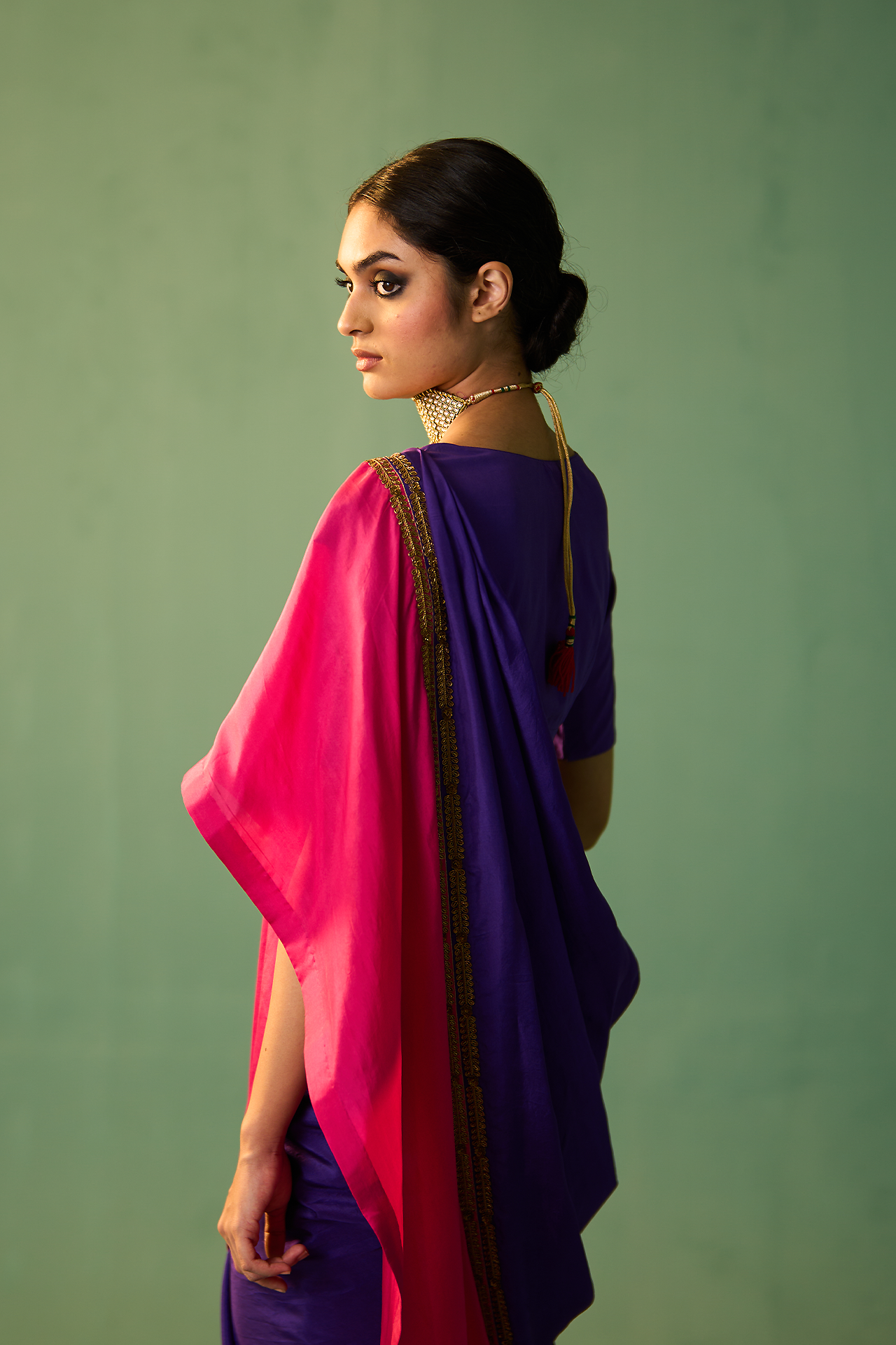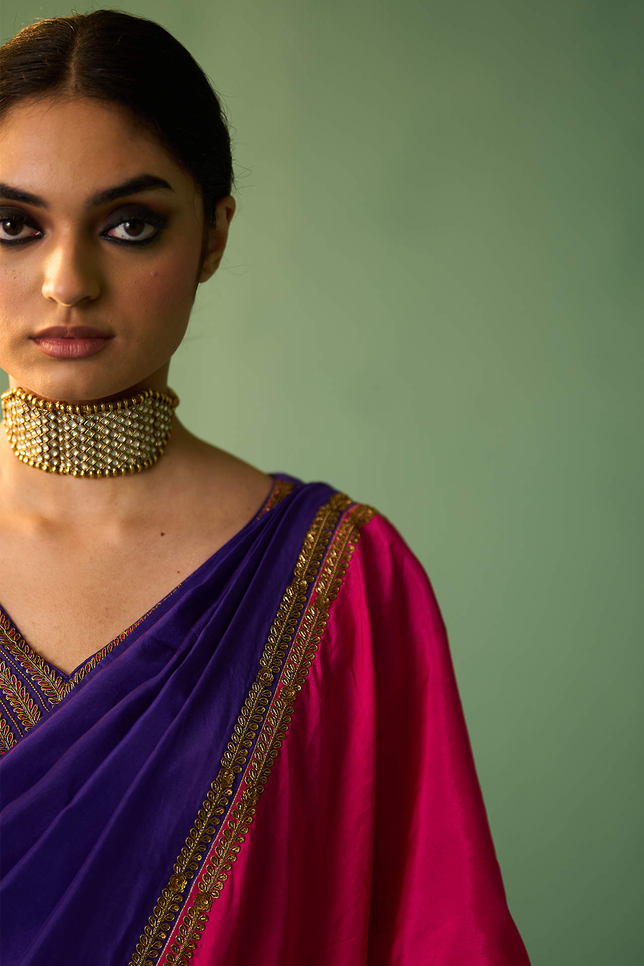 Description: 'DHARA' Indigo & Rani Pink saree is made through two contrast coloured Habutai silk, which allows for a better suited drape and fall