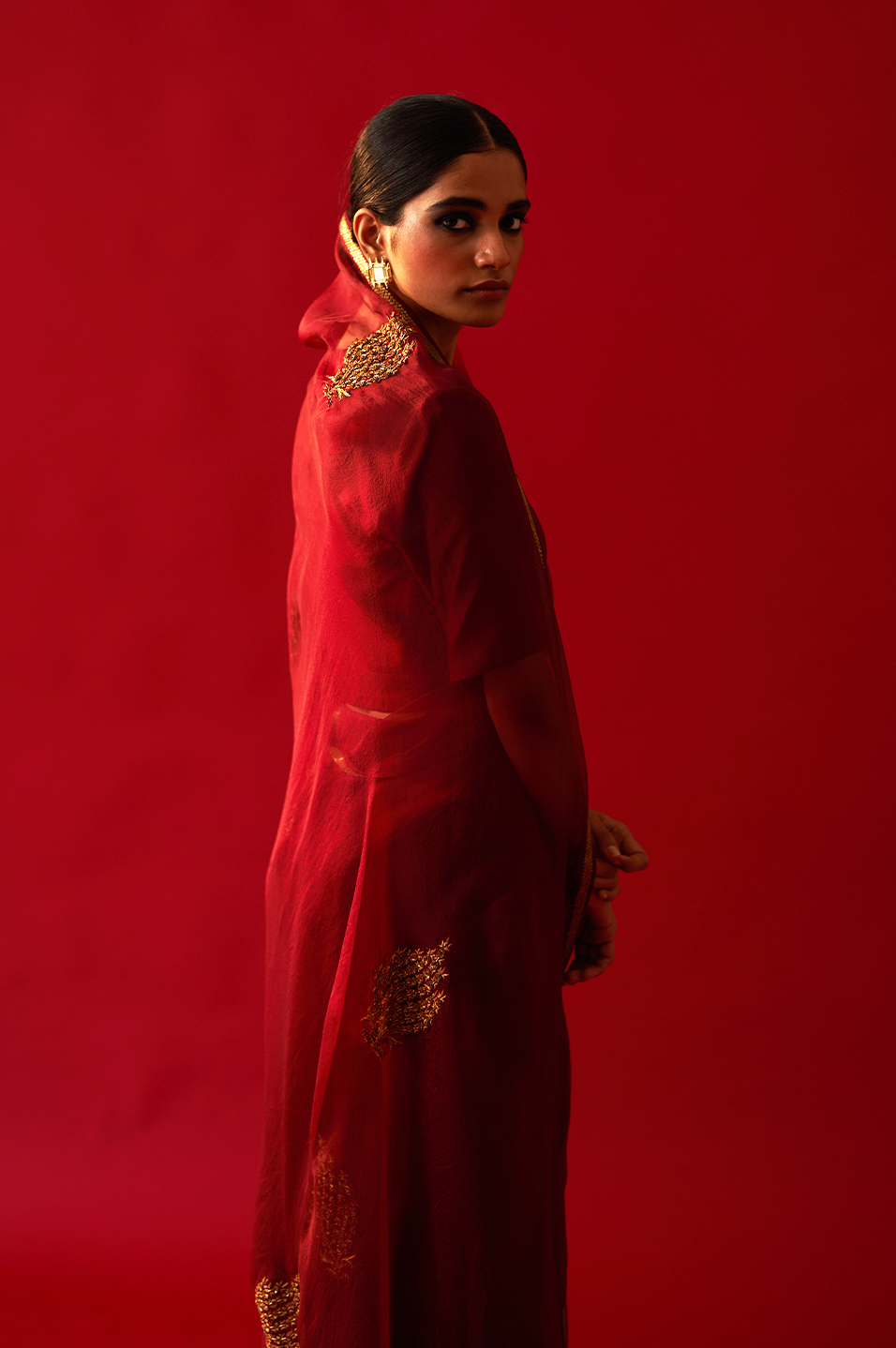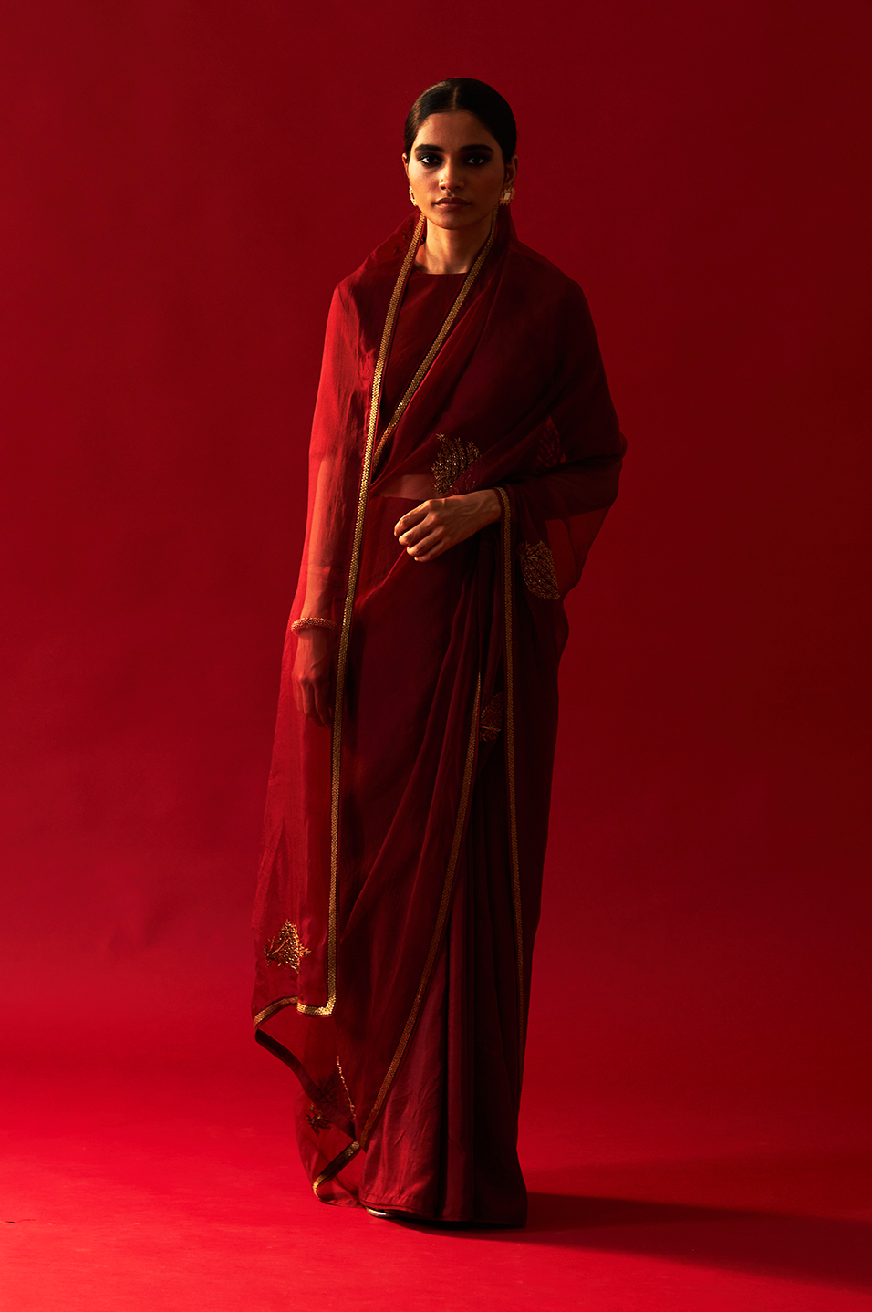 Description: 'JAMEELAH' Maroon Red saree is made through half & half organza silk and plain Habutai silk, which allows for a better suited drape and fall