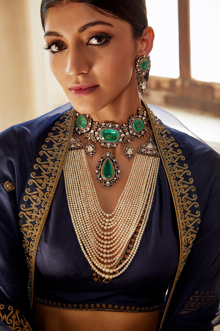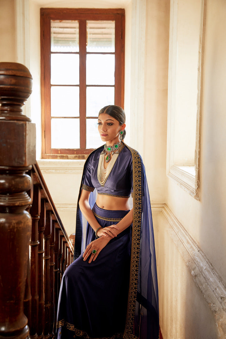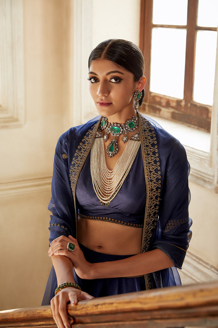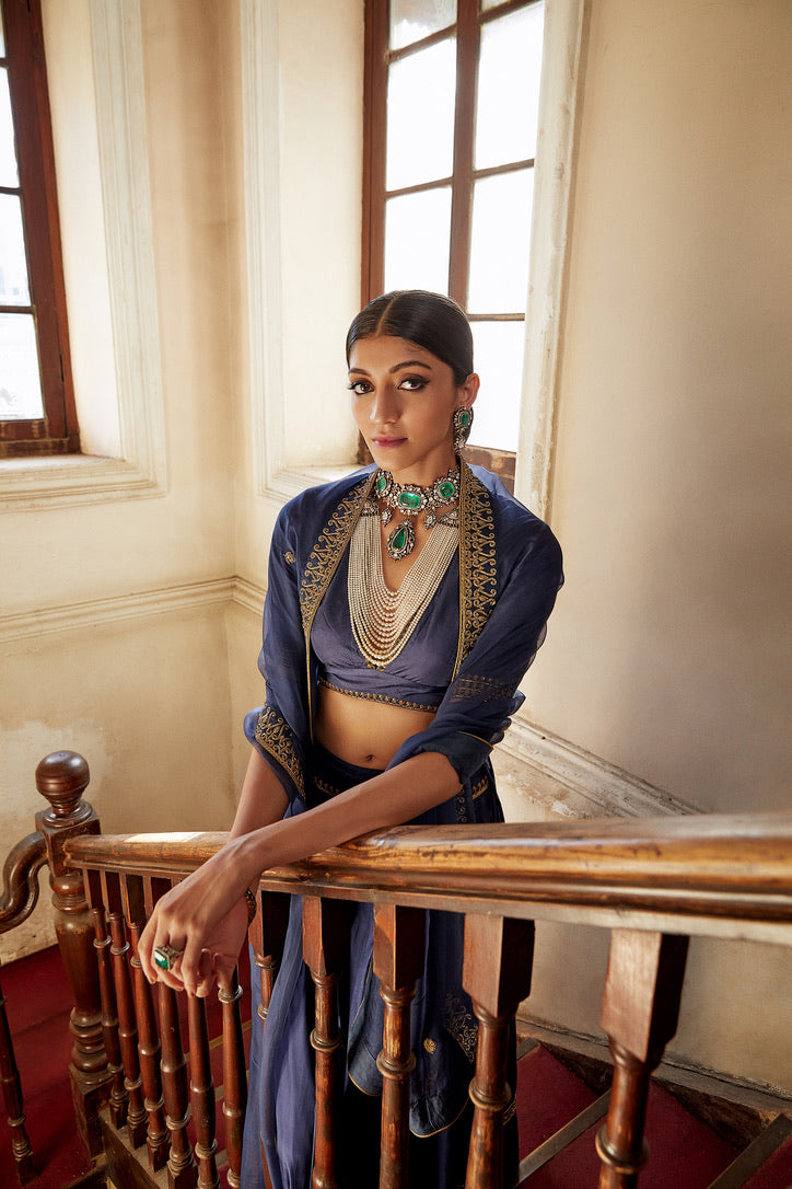 Description: 'SHABNAM' Indigo Habutai silk Lehenga is paired with deep v-neck Habutai silk Blouse & organza Dupatta