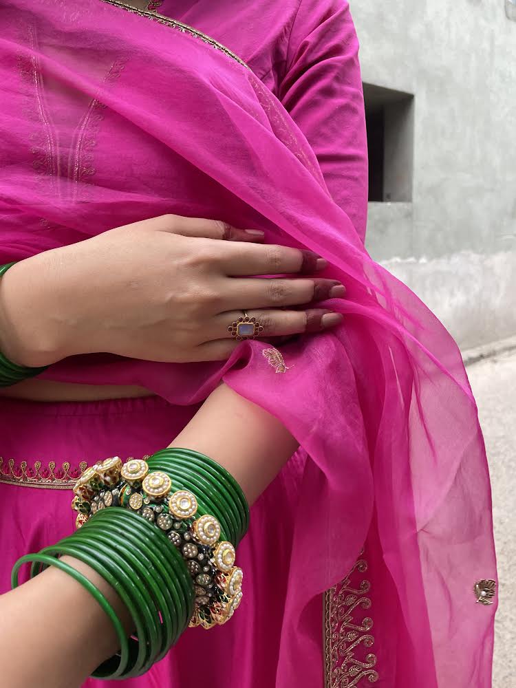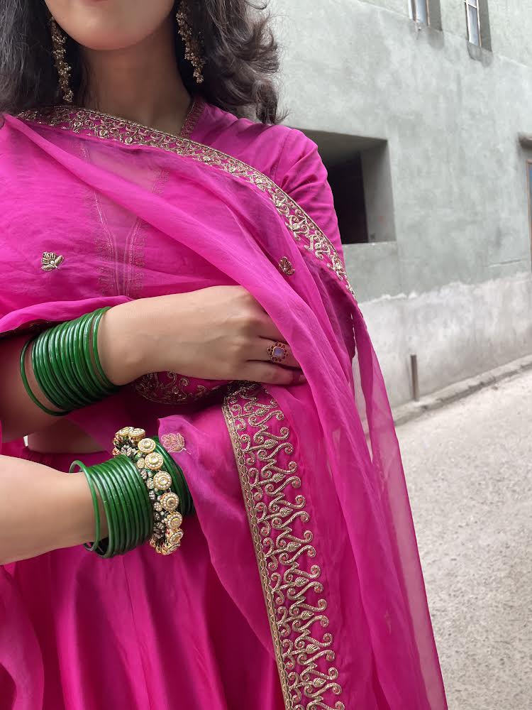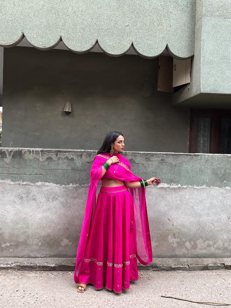 Description: 'SHABNAM' Rani habutai silk Lehenga is paired with deep v-neck habutai silk Blouse & organza Dupatta